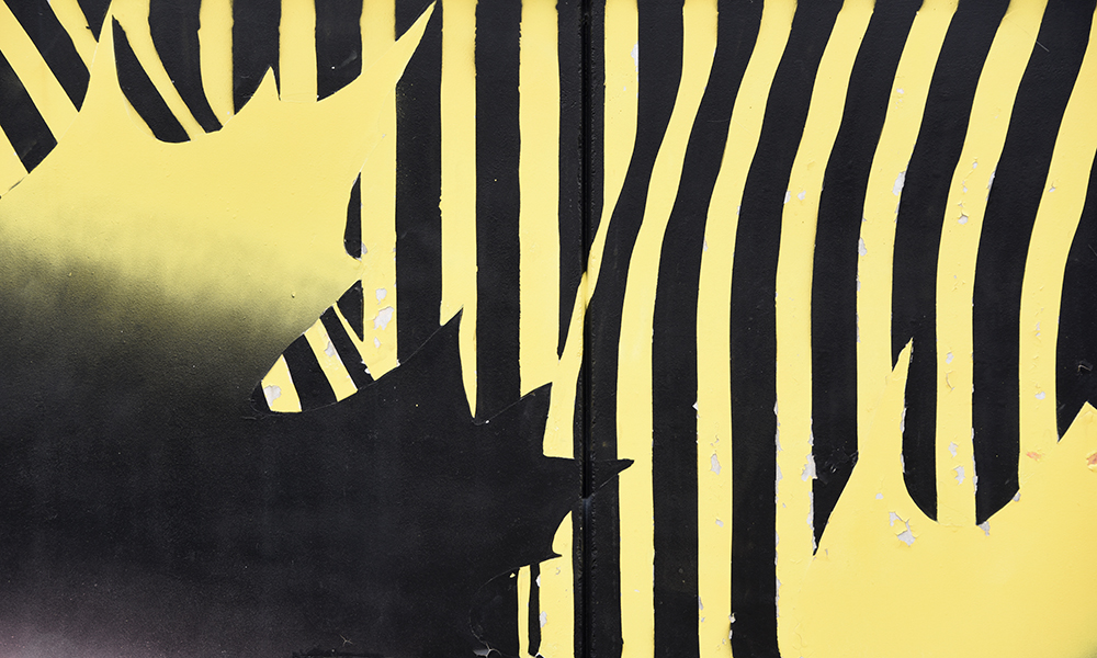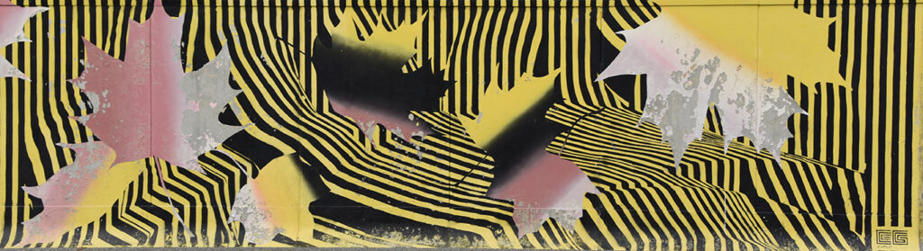 ville. Il représente des feuilles d’érable, symbole de croissance, de régénération et de vitalité. Les feuilles sont réalisées avec la technique du pochoir, ce qui permet de créer des formes précises et de travailler rapidement. Le fond optique amplifie la force des feuilles d’érable, les mettant en évidence. L’œuvre invite à réfléchir sur la résilience de l’être humain et de la nature ainsi que les possibilités de reprise et de renaissance après les tragédies. La fresque veut aussi être un signe d’espoir et d’engagement pour l’avenir de