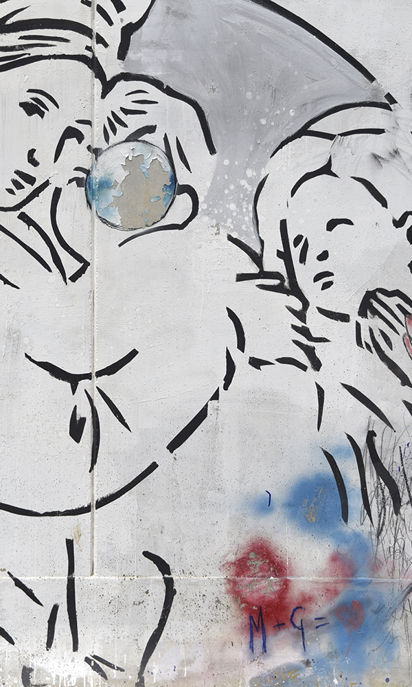 J'ai utilisé des pochoirs, de l'acrylique et du plâtre sur le mur pour transmettre l'idée qu'il n'y a de place dans la rue que pour une humanité spontanée, concrétisée dans une simple image emblématique.