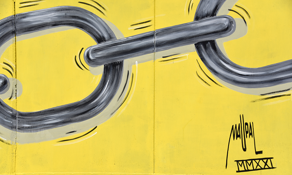 tedesco Mein Wandbild vermittelt eine leicht verständliche Botschaft, die sowohl die Aufmerksamkeit der Großen als auch der Kleinen auf sich zieht. Ich habe eine Kette geschaffen, die dann durch Zangen gebrochen wird und das ist eine Metapher für den Hass auf unsere kranke