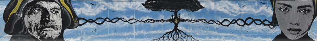 francese La fresque veut représenter le récit de la nuit du 29 juin 2009. On commence à lire de gauche: une main, métaphore de vie, est interceptée par une balle blanche, l’événement dramatique. Puis, on a la destruction. Le bras devient squelette, 29, un dramatique bras rendu squelette qui embrasse l’infini.