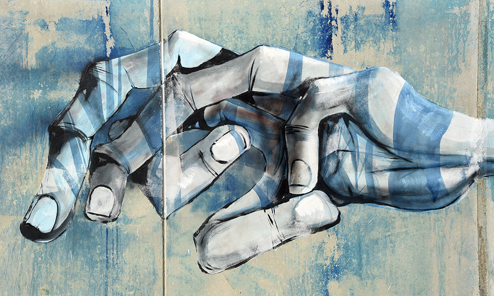 from the left: a hand of flesh, a metaphor for life, is intercepted by a white ball, the dramatic